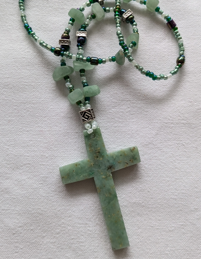 Pierre de 3 à 4 cm. de hauteur, fil de 22 à 25 cm de long. Montage sur 2 rangées de perles, sur fil nylon.